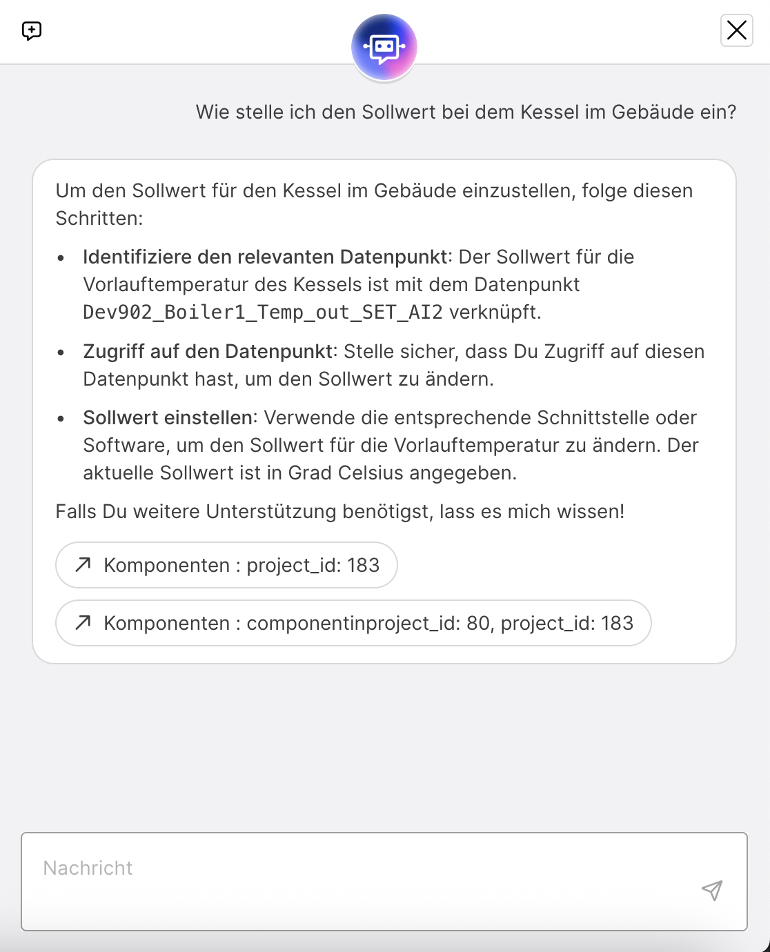 Die Antworten sind präzise auf die Voraussetzungen im jeweiligen Gebäude zugeschnitten. Wenn sie auf ihre Antwort Feedback erhält, kann der digitale Gebäudeassistent diese neuen Informationen außerdem bis zu einem gewissen Umfang kontextbasiert in seine zukünftigen Antworten mit einfließen lassen.