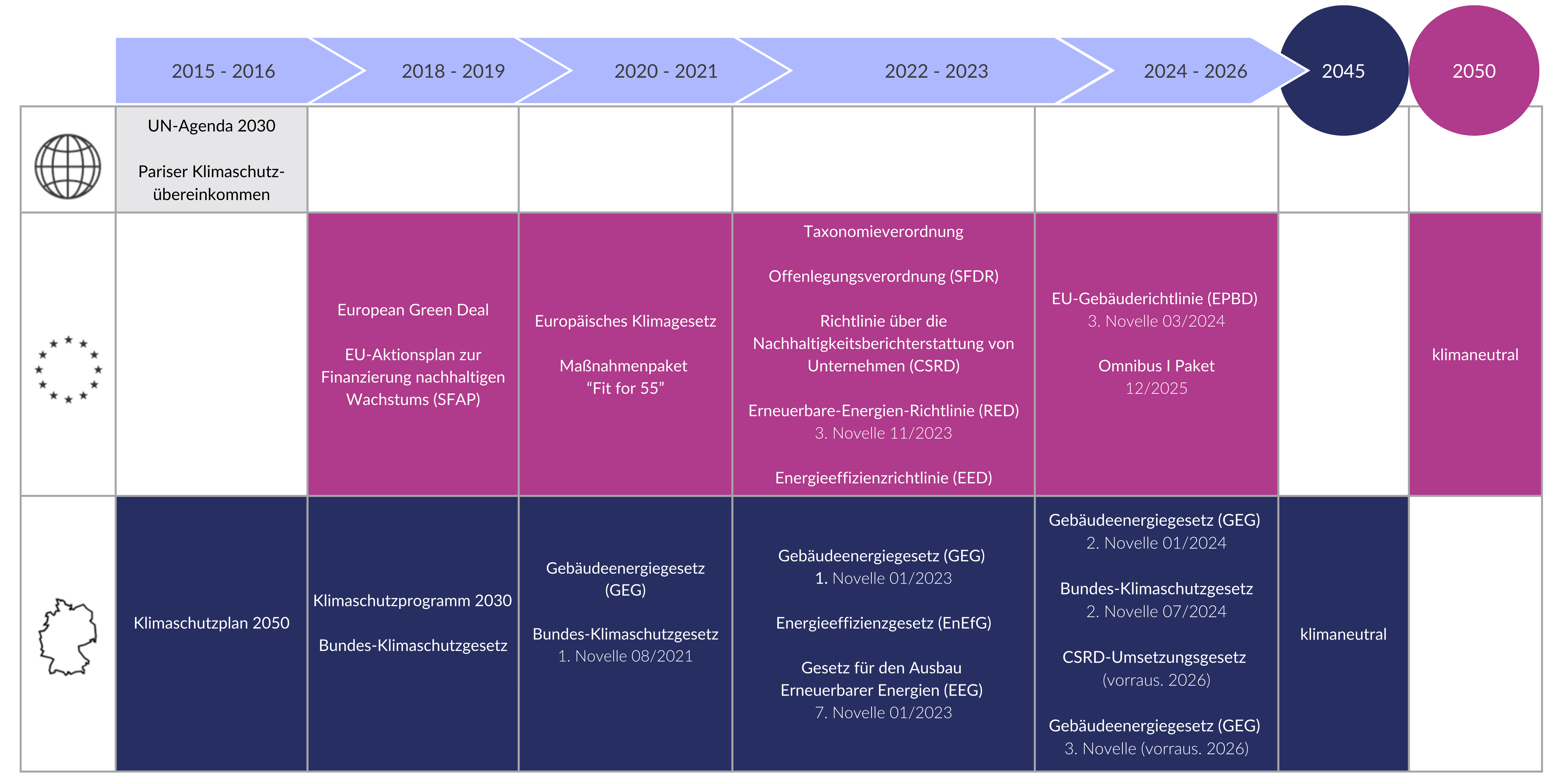 Mit dem Europäischen Klimagesetz wird die Verwirklichung dieser Ziele zu einer rechtlichen Verpflichtung. Dem Gebäudesektor kommt dabei eine Schlüsselrolle zu. Denn um die Klimaziele einzuhalten, müssen laut Klimagesetz alle neu errichteten Objekte bis 2030 CO2-neutral sein. Ab 2050 gilt dies für den gesamten Bestand. 2021 hat auch Deutschland sein Bundes-Klimaschutzgesetz nochmals verschärft und das Endziel der Netto-Treibhausgasneutralität von 2050 auf 2045 vorgezogen.