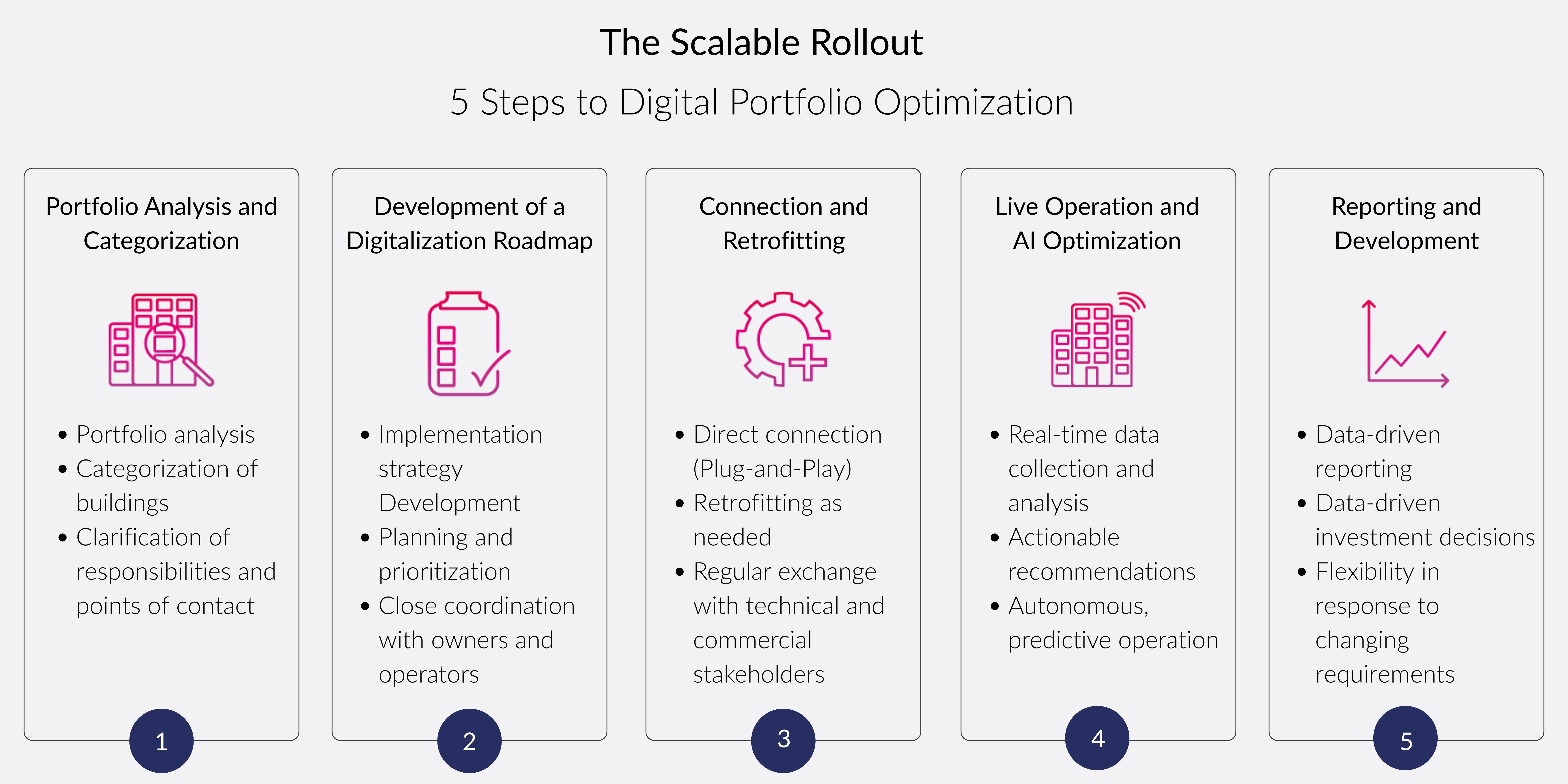 While individual digitalization measures in lighthouse projects offer value, the true leverage lies in a portfolio-wide rollout. A structured, adaptive implementation process is crucial, especially for heterogeneous portfolios with different building types, years of construction and technical standards.
