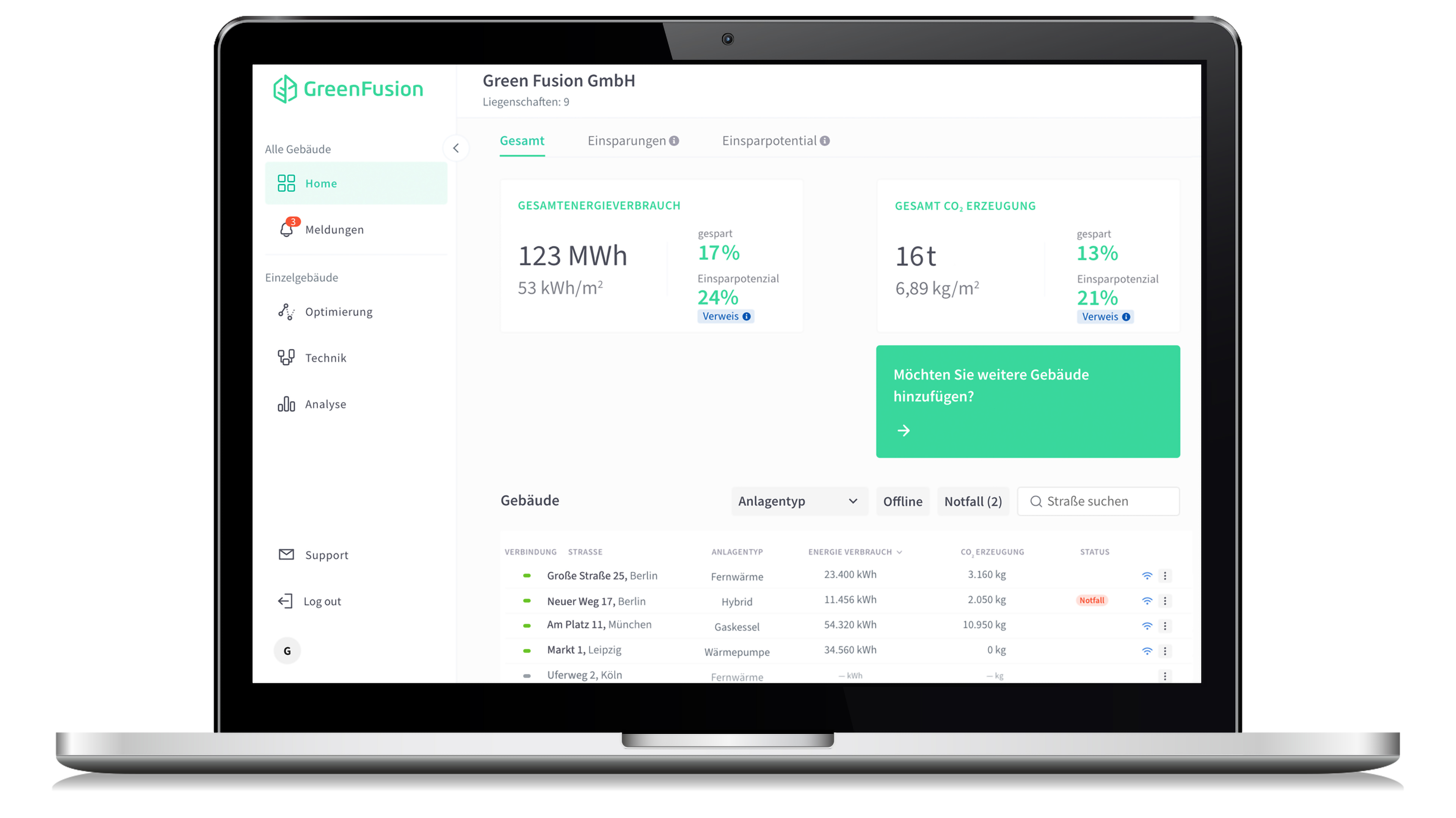Green Fusion se concentre sur le secteur du bâtiment résidentiel. Son système de gestion énergétique basé sur le cloud surveille, optimise et pilote les systèmes de chauffage et d’énergie à l’aide de l’intelligence artificielle. Une fois installée, une « GreenBox » permet de relier l’installation de chauffage à la plateforme logicielle. L’installation est assurée par les techniciens internes de Green Fusion et par un réseau de partenaires expérimentés couvrant l’ensemble de l’Allemagne.