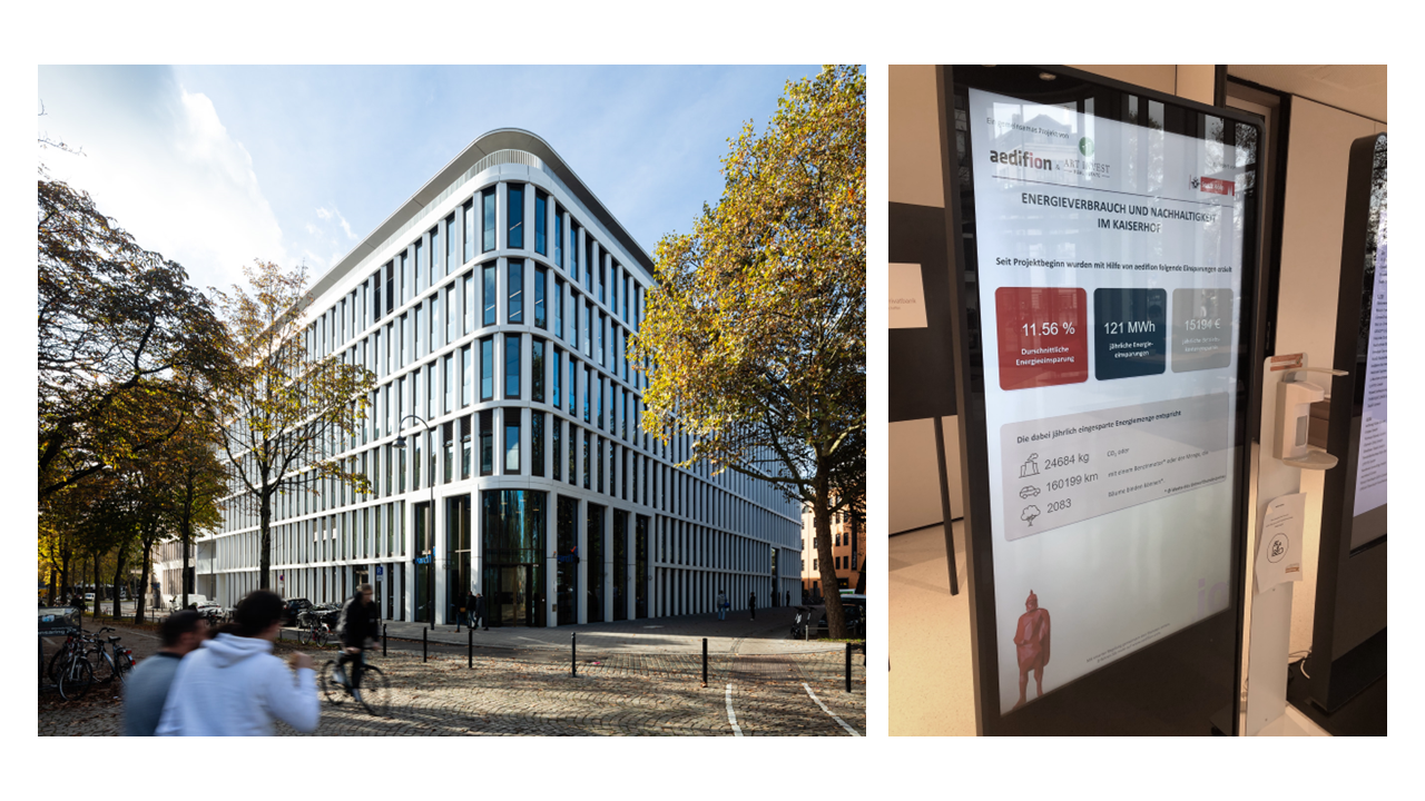 Dans le cadre du projet subventionné « SmartCity Cologne GO », aedifion a élaboré pour l’immeuble de bureaux Kaiser Hof de Cologne, en Allemagne, un concept de visualisation destiné à informer les occupants et visiteurs du bâtiment sur leur consommation d’énergie et leurs émissions. En complément, l’affichage fournit des conseils personnalisés pour réduire davantage cette consommation. L'installation crée ainsi, sans grand effort et avec un appui technologique, une incitation intuitive à adopter un comportement plus responsable en matière d’énergie.