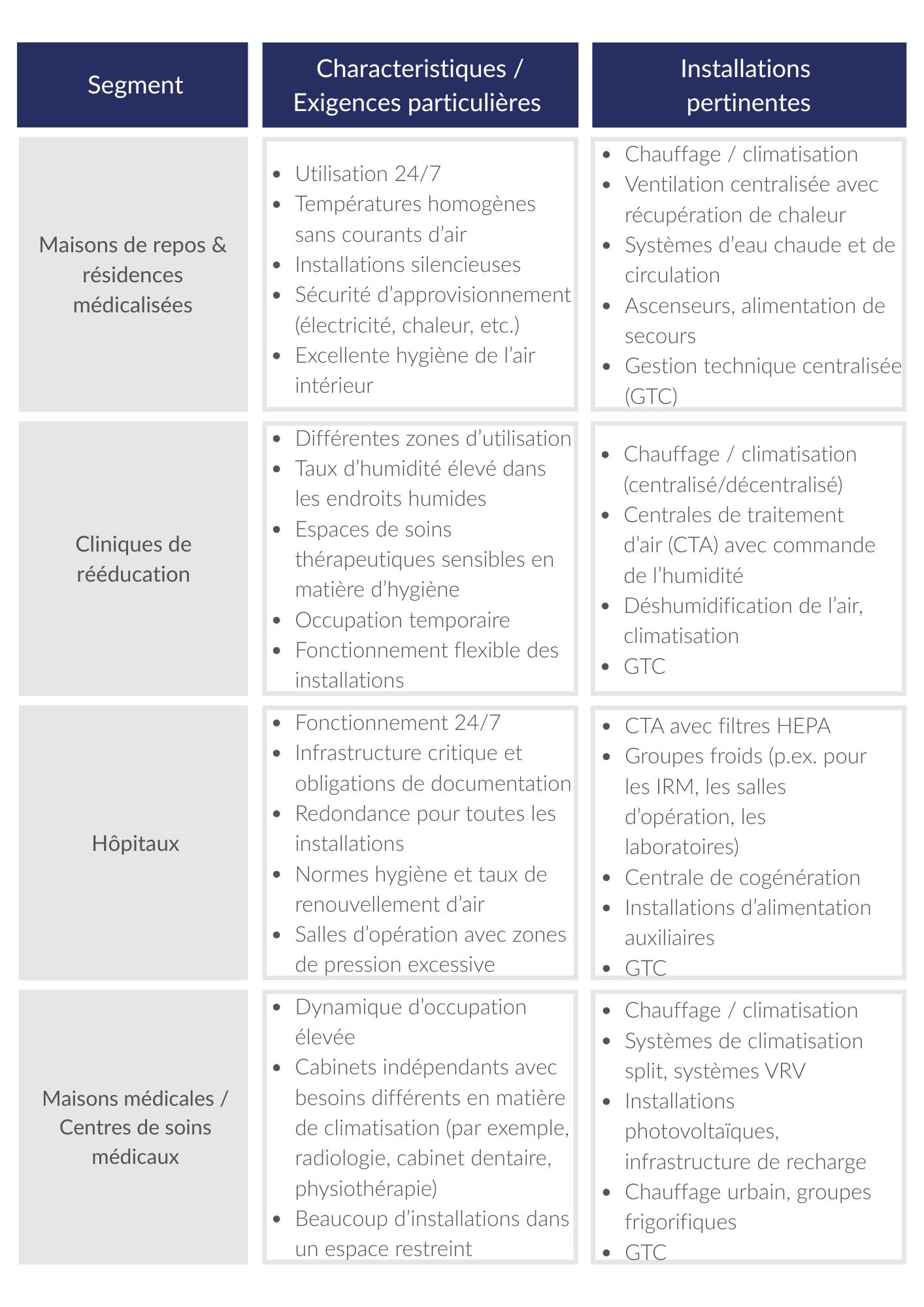 Les exigences d’exploitation peuvent varier considérablement en fonction de l’utilisation prévue. L’aperçu suivant fournit des exemples d’exigences typiques et d’installations techniques pertinentes relevant de la technologie du bâtiment dans différents segments de la classe d’actifs « Santé ». Cet aperçu ne prétend pas être exhaustif, mais il illustre clairement l’éventail des défis auxquels les exploitants et les planificateurs sont confrontés au quotidien :