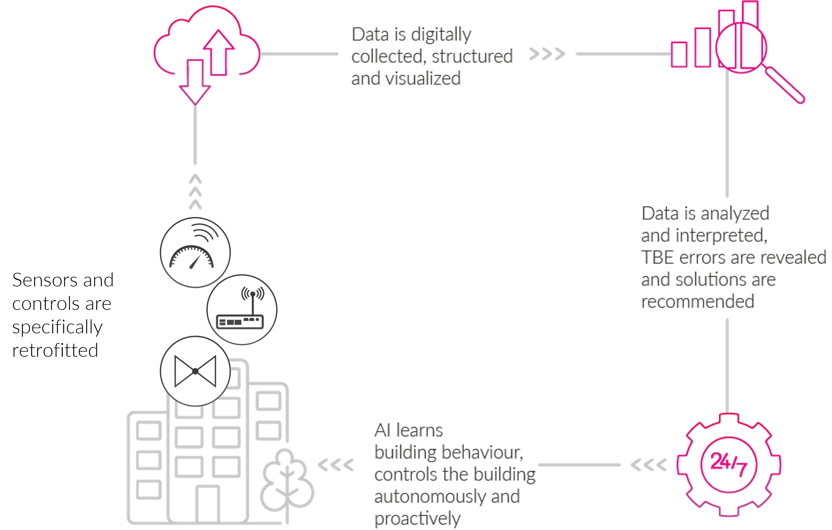 - In buildings that already have digital communication interfaces, software solutions for digital operational optimization can be easily connected directly to collect data from IoT devices or automation systems and structure it in a cloud platform.