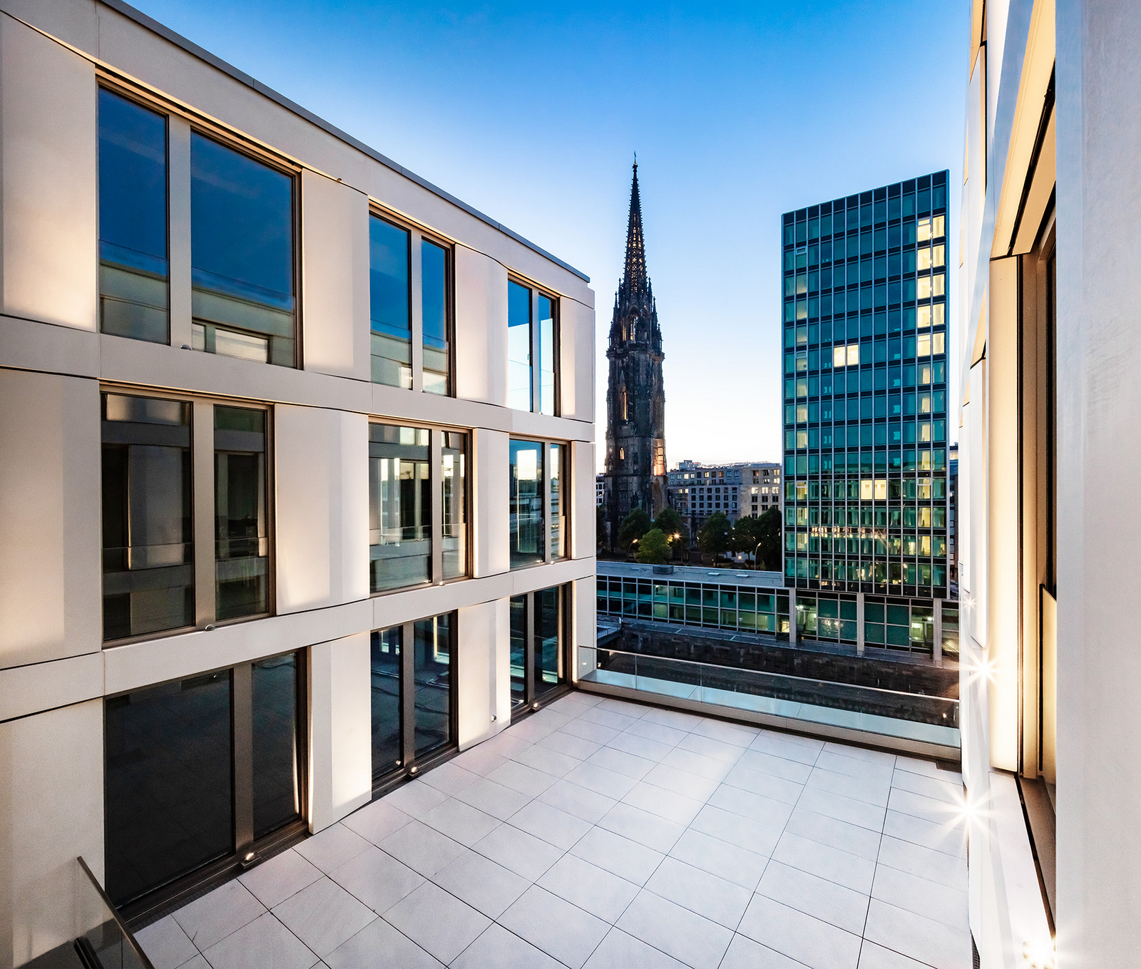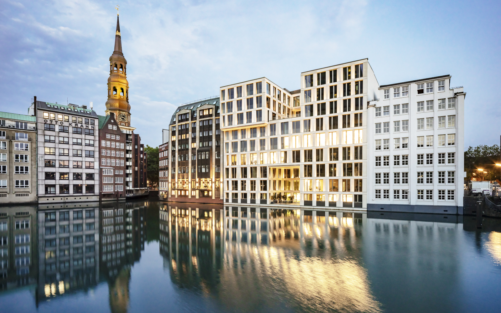 At the Nikolaifleet in the heart of Hamburg, the landmark building KATHARINENKAI was completed in March 2022, offering approximately 10 000 m² of gross floor area with a prime waterfront location. Designed by the architectural firm SKAI, this modern office property features flexible usage concepts and holds LEED Gold and WiredScore Gold certifications. The project was developed by the MOMENI Group, renowned for high-quality real estate projects with innovative use concepts.