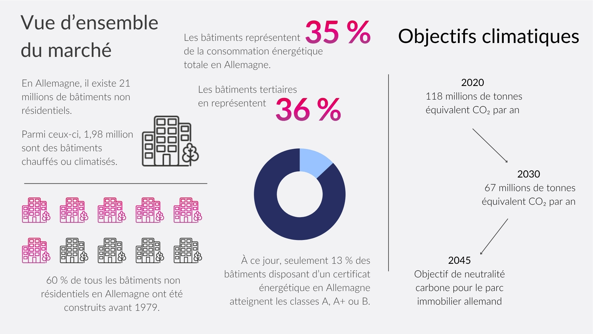 Les autorités européennes se sont fixé un objectif ambitieux : atteindre la neutralité carbone d’ici 2050. Cet objectif s’applique aux propriétaires et exploitants immobiliers. Mais les considérations écologiques ne sont pas les seules à exiger une trajectoire proactive vers le « net zero ». La valeur des portefeuilles immobiliers est aussi en jeu : si les bâtiments ne s’alignent pas sur les objectifs du Pacte vert pour l’Europe, ils risquent de perdre de leur valeur. Exemple : près de 1,98 million de bâtiments non résidentiels chauffés ou climatisés en Allemagne seulement sont concernés. Sans stratégie claire, beaucoup d’entre eux pourraient rapidement devenir des actifs bloqués, aussi appelés « stranded assets ».